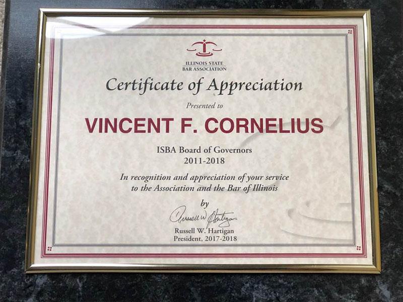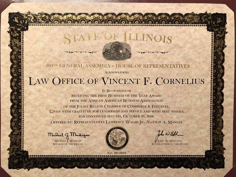 The Law Office of Vincent F. Cornelius is so very honored to receive the first Business of the Year Award from the African American Business Association of the Joliet Chamber of Commerce - November 2018