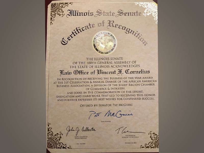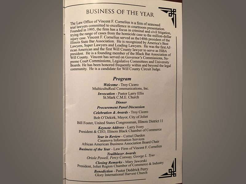 The Law Office of Vincent F. Cornelius is so very honored to receive the first Business of the Year Award from the African American Business Association of the Joliet Chamber of Commerce - November 2018